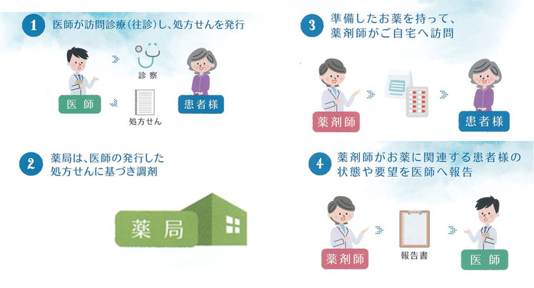 薬剤師は 薬の専門家 として、通院が困難であって自宅(在宅)で療養を行っている患者様に対し、医師の指示に基づき患者様のお宅を訪問して、お薬の正しい飲み方の説明や副作用・相互作用の確認、保管方法の説明などを行います。